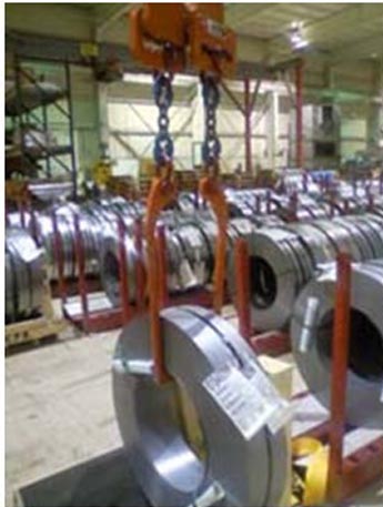 其配套使用的吊鉤具有2英寸的調(diào)節(jié)范圍,可以搬運和移動不同厚度的卷材。Coil Plus部門維護與安全負(fù)責(zé)人Larry Wood表示,其主要特點是底腳可以進行旋轉(zhuǎn),為便于鋼卷移動,吊鉤可以向下移動,這樣底腳可以降低到與鋼卷平行的位置。當(dāng)?shù)啄_到達鋼卷所處的位置時可以實現(xiàn)90°旋轉(zhuǎn),這樣就可以對目標(biāo)鋼卷進行起吊作業(yè)而不磕碰相鄰位置上的其他鋼卷。