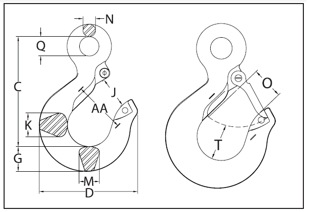 • 鍛造合金鋼 — 淬火和回火。 • 每個吊鉤都以凸字顯示用于材料可追溯性的產(chǎn)品標識碼 (PIC)、尺寸以及名稱 Crosby 和 U.S.A。 • 比 80 級的強度高 25%。 • 平面經(jīng)過工程加工以便與 S-1325A 耦合器連桿配合使用。 • 環(huán)眼吊索吊鉤包括兩種鍛造到產(chǎn)品中的戰(zhàn)略放置標志,它們表示兩 (2) 個 QUIC-CHECK® 特點:變形標志和角度標志。 • 低剖面鉤尖。 • 采用符合世界起重標準的 S-4320 集成閉鎖。 • 重型沖壓閉鎖與鉤尖聯(lián)鎖。 • 高周期、長壽命的彈簧。 • 當通過鉤尖孔固定合適的開口銷時,可用于 OSHA Rule 1926.550(g) 的人員升降目的。 • 逐個在 2.5 倍工作負荷限制條件下進行驗證測試并經(jīng)過認證。 • 適用于 100 級和 80 級鉤鏈。 • 額定疲勞在 1.5 倍工作負荷限制時為 20000 個周期。 • “尋找鉑金色 — Crosby 100 級合金產(chǎn)品!