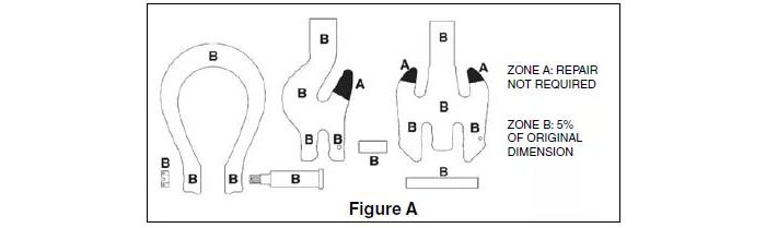 ● 停止使用:集成主環(huán)或配件如出現(xiàn)裂紋,缺口時(shí),需要請(qǐng)專業(yè)人員對(duì)產(chǎn)品進(jìn)行修理,專業(yè)人員必須沿鍛件輪廓進(jìn)行垂直磨修,并保證尺寸的損耗不超過(guò)表 fig A 中規(guī)定的范圍,如超出此范圍,則產(chǎn)品不能再使用。