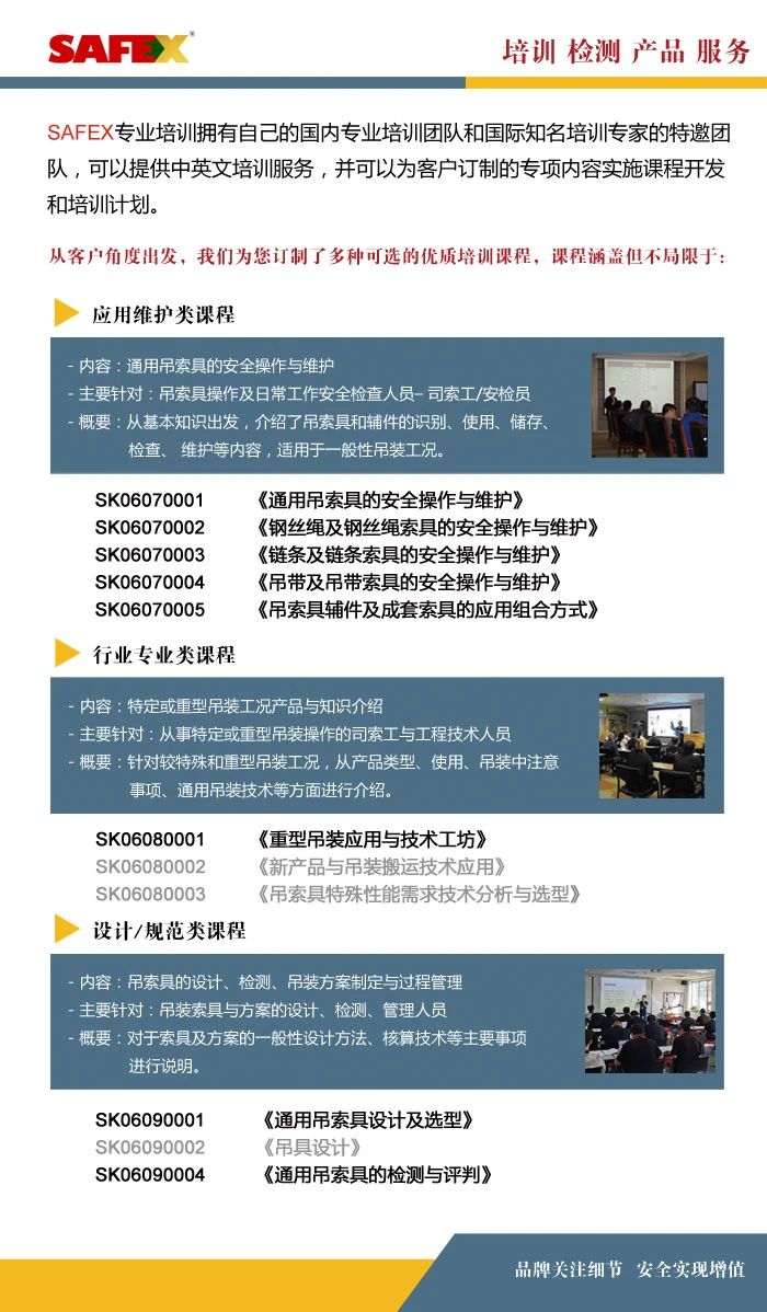 GLE作為一家專業(yè)的工業(yè)吊裝工程與索具產(chǎn)品服務(wù)供應(yīng)商,為您提供系統(tǒng)的吊索具技能培訓(xùn)課程(適合司索工/安檢員/工程技術(shù)人員/安全管理人員等)和在用設(shè)備全面檢測服務(wù)(適合公司日常性設(shè)備和索具的檢測)。