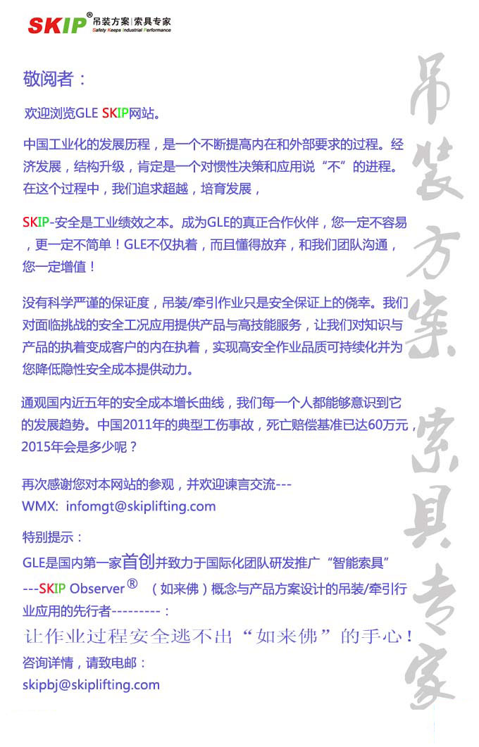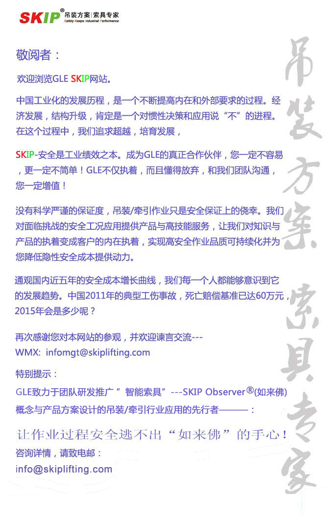鄭重聲明:www.jefpa.cn為我公司合法合規(guī)官方網站。 GLE為美國CROSBY及英國Straightpoint在中國大陸合作伙伴, 進口Kuplex8+10品牌索具系列輔件產品國內供貨商!假冒偽劣者請注意國外制造商可能發(fā)起的知識產權法律訴訟風險。 凡屬利用我公司SKIP品牌提供相關產品與服務業(yè)務,請及時與我司進行真實性驗證。驗證郵箱:郵箱:info@skiplifting.com